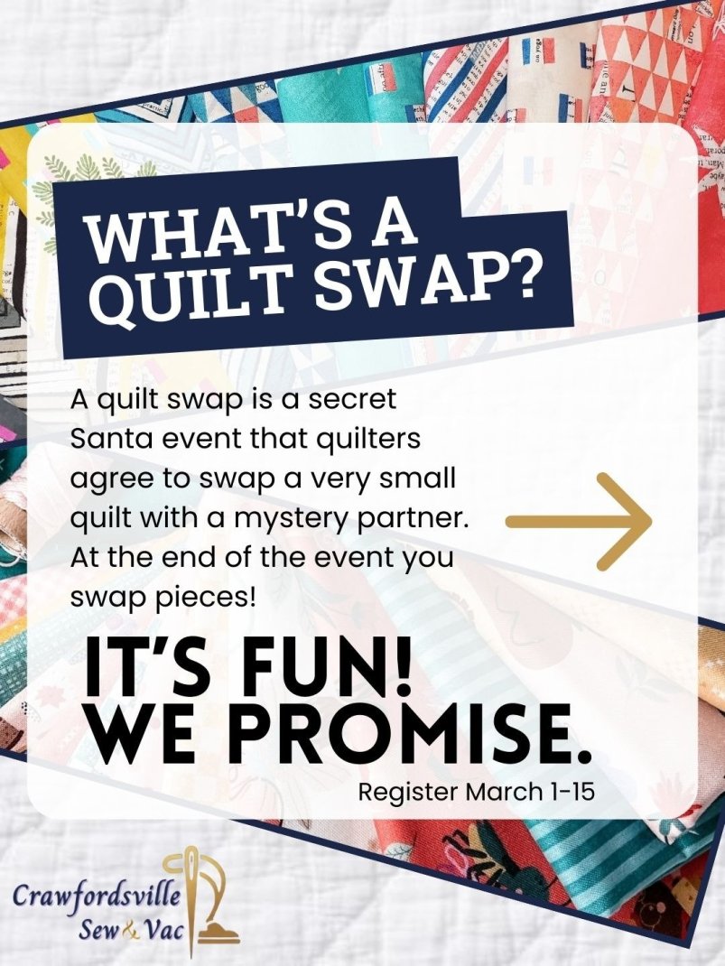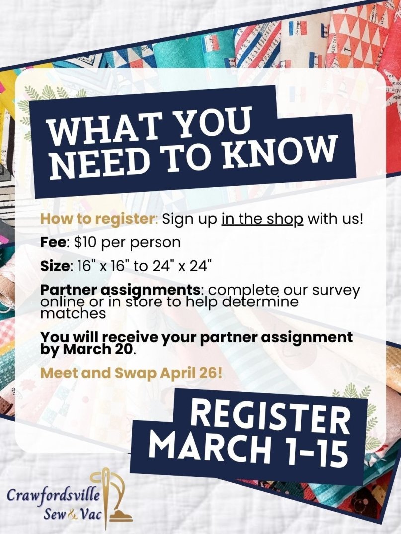 After signing up you will receive an email from Crawfordsville Sew & Vac with your preferences. Fill out the Google Form you receive through email by March 14th. We will pair you with a mystery partner by March 20 and then Sunday, April 26 at 12 pm we will come together for donuts, hanging out, and swapping quilts with your mystery partner!